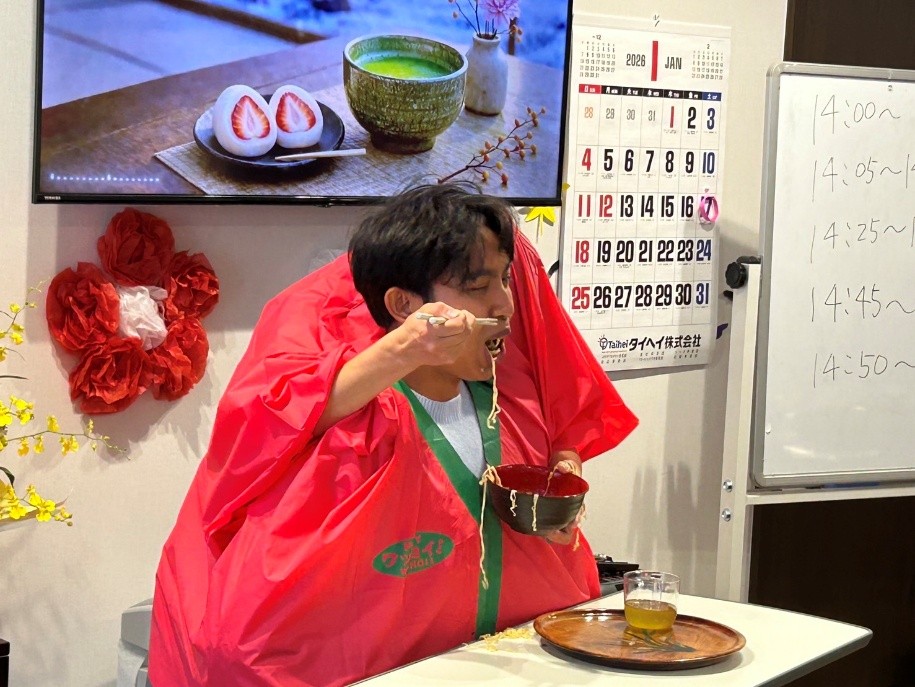 職員による二人羽織、家族様と記念写真、一月一日合唱を皆で行いました。