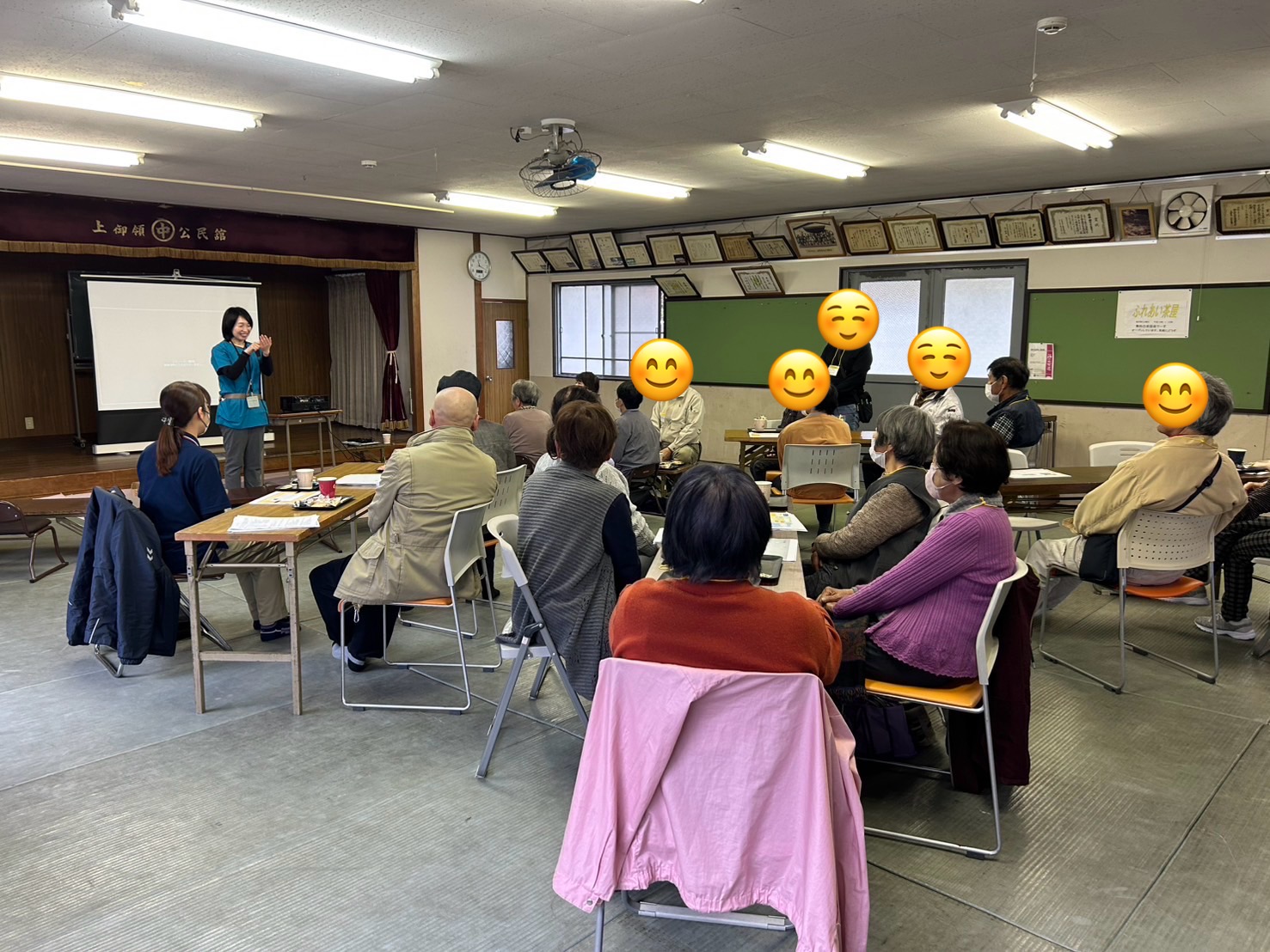 上中公民館をお借りして、記念すべき第1回目は18名の方にお越しいただき、講話を聞いたりお飲み物やお菓子をつまみながら介護のこと、ご自身のことについて和気あいあいとお話しされ盛り上がっていました☕️