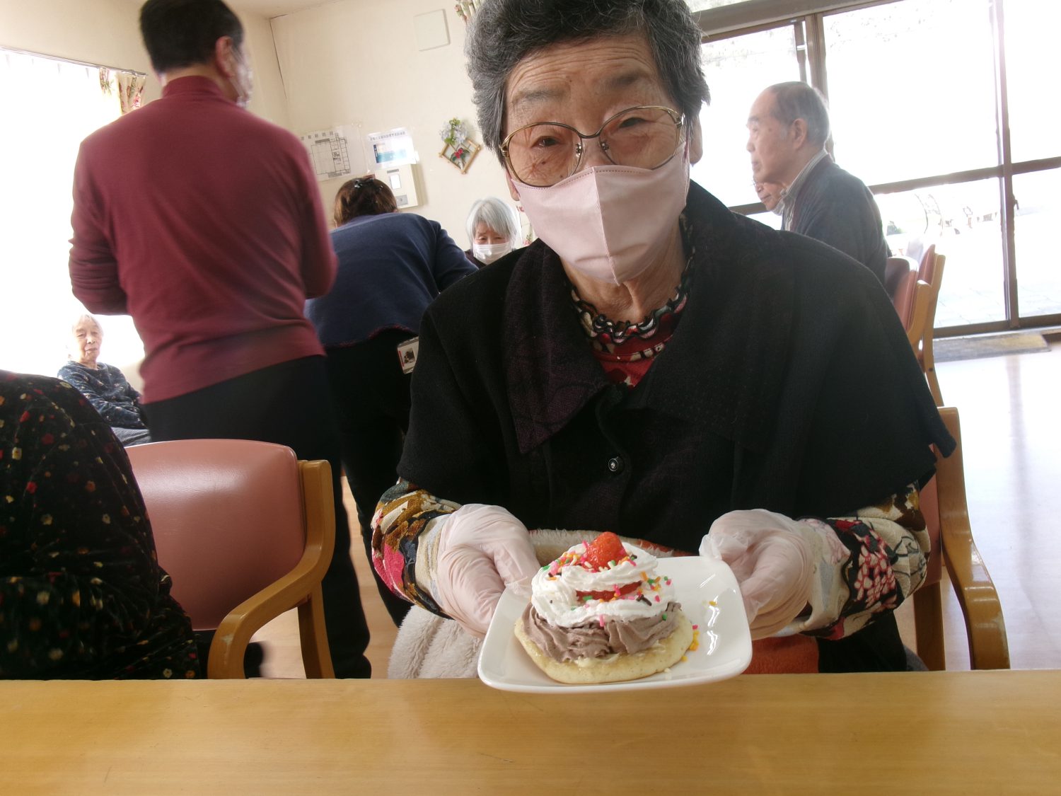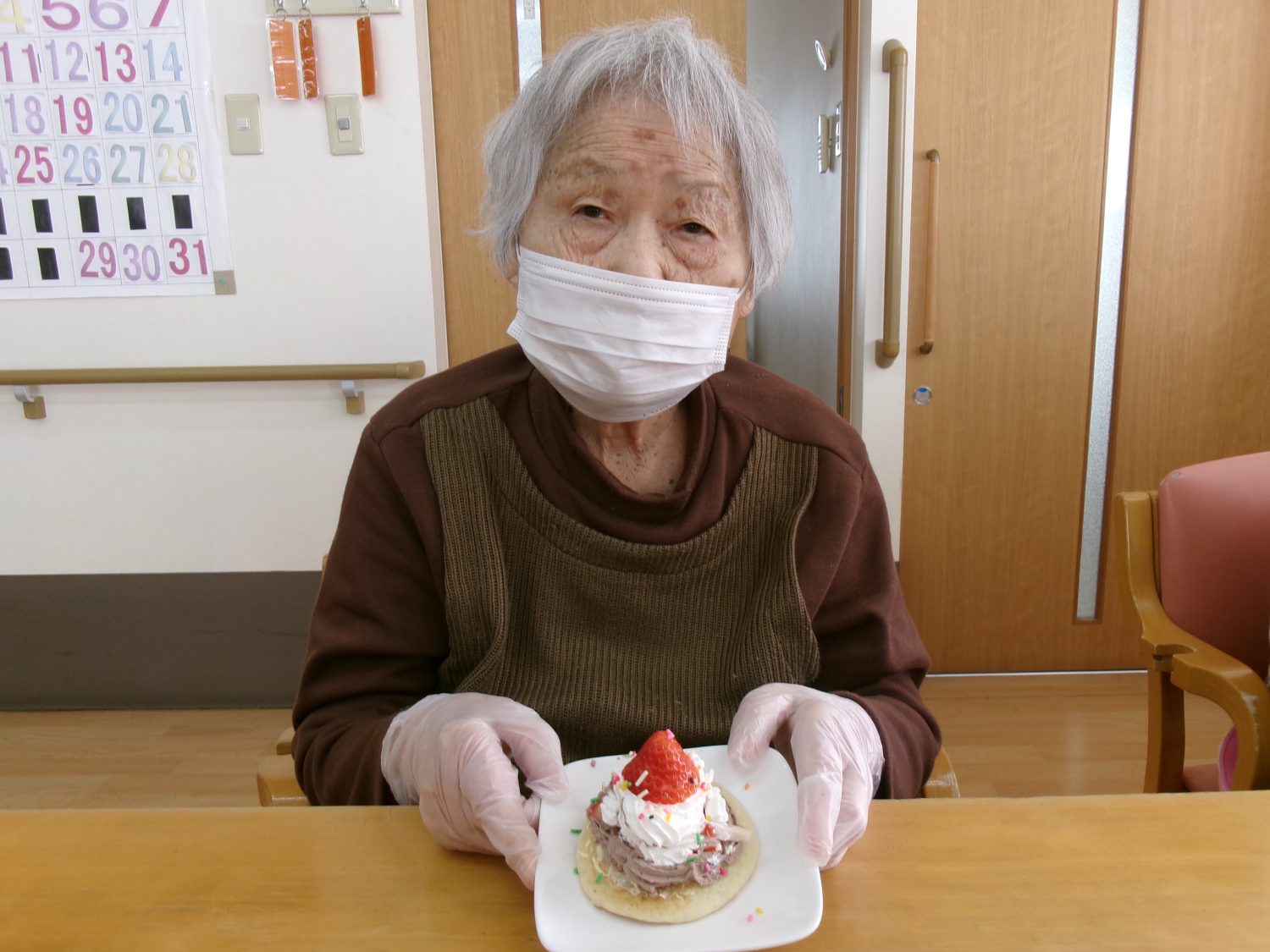 いちごをのせる際、「きれいにできないね、ごめんね」とおっしゃる利用者様もおられましたが、完成すると「かわいいね」と笑顔が見られ、とても喜ばれていました。