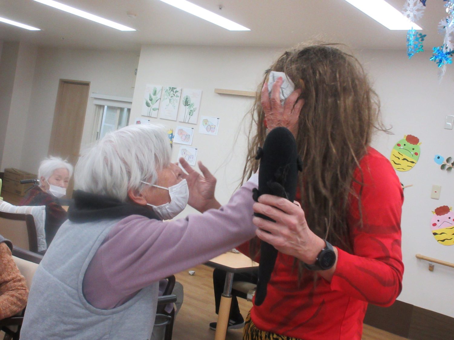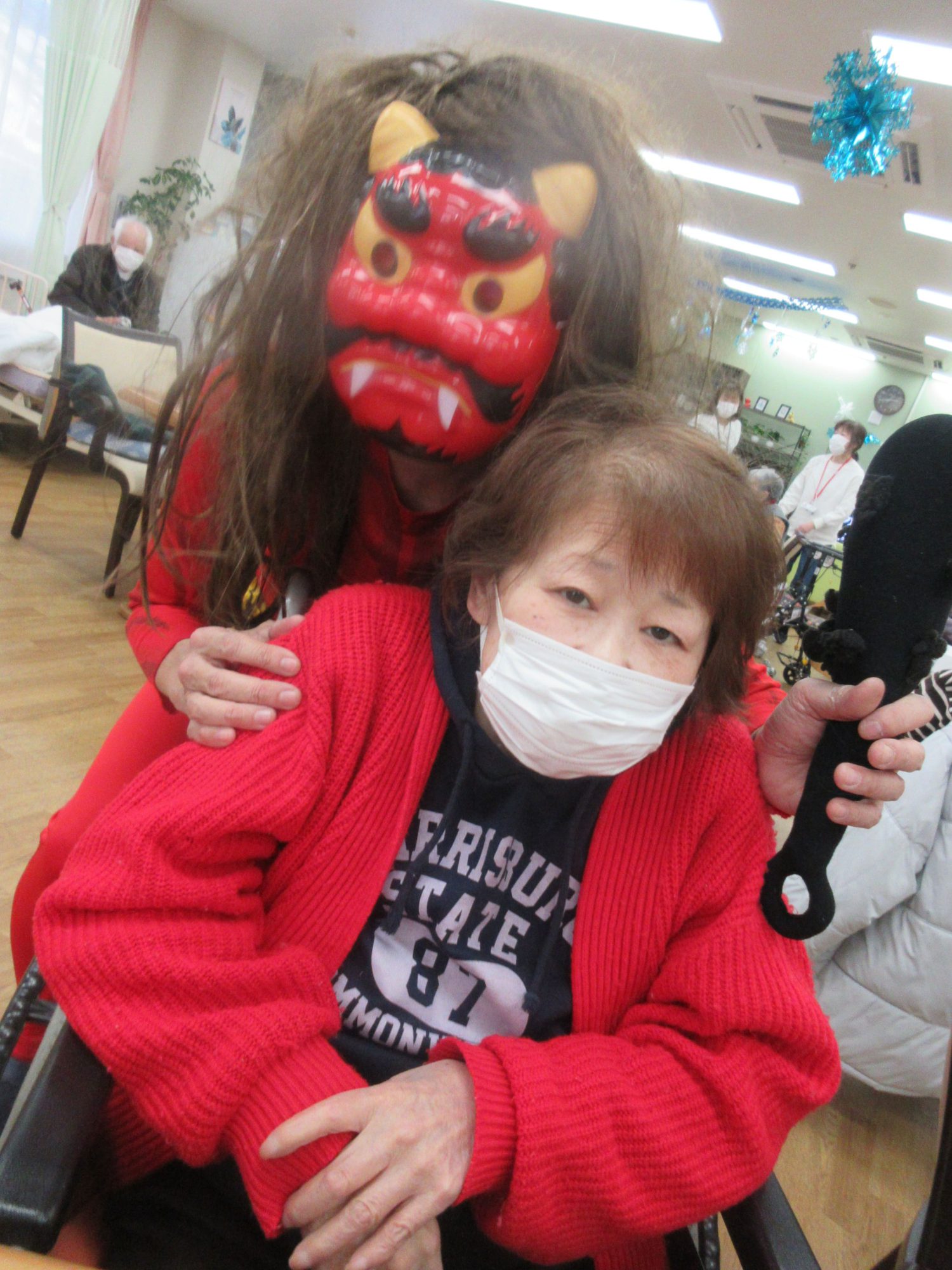 午後からは、鬼も登場し『鬼は~外!福は~内』と言いながら新聞紙豆を尾にめがけて投げられました✨