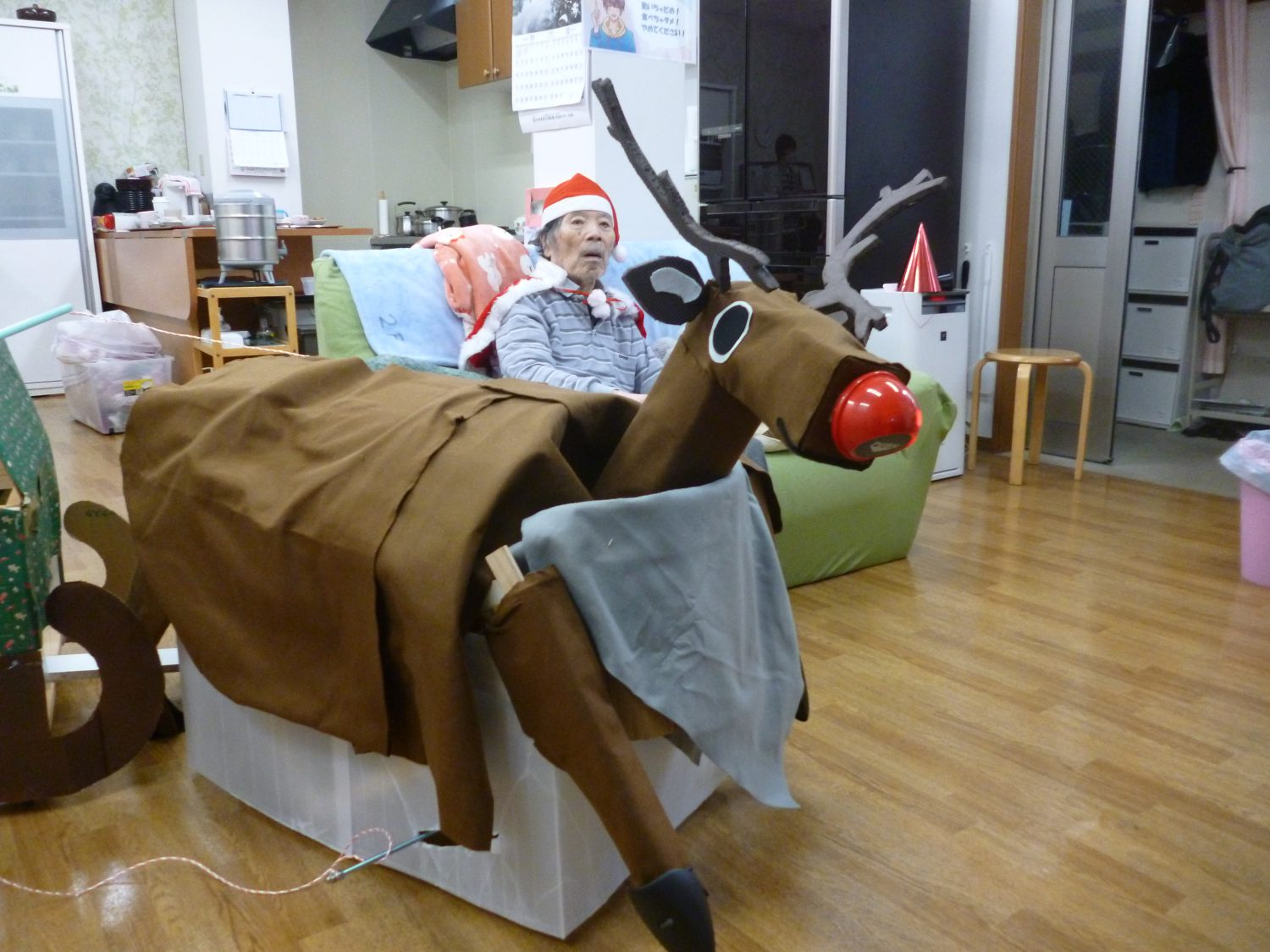 職員渾身の作のトナカイ(鼻が光って足が動いておまけに電動で走ります♪)とソリも大活躍しました!