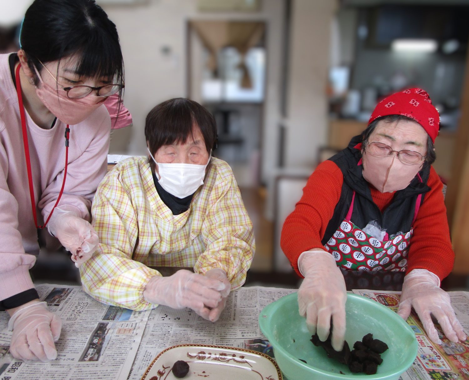 あんこを丸めたり、皮をこねたりと