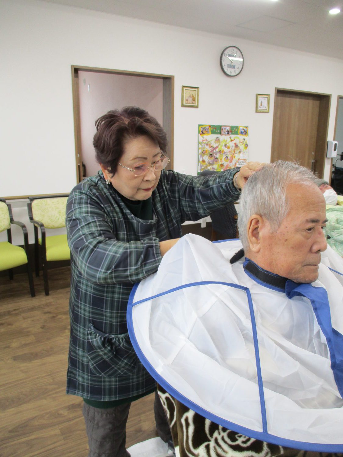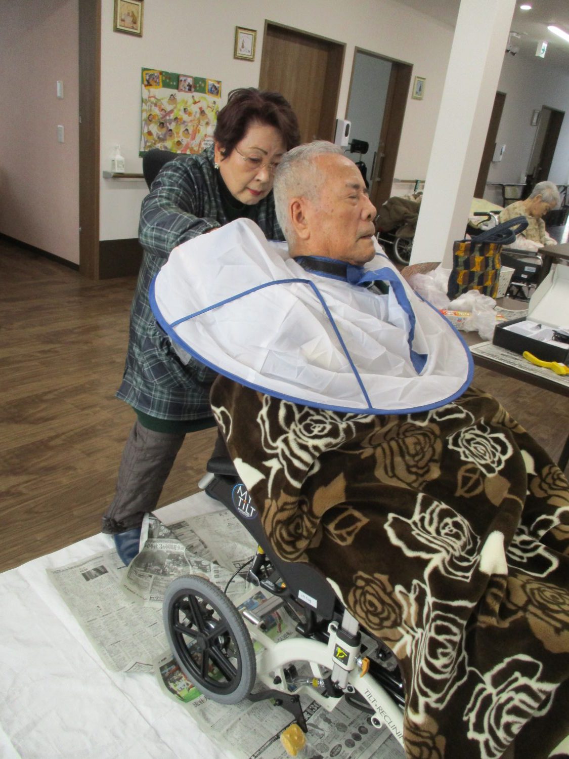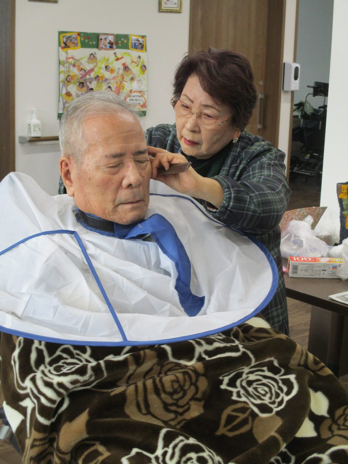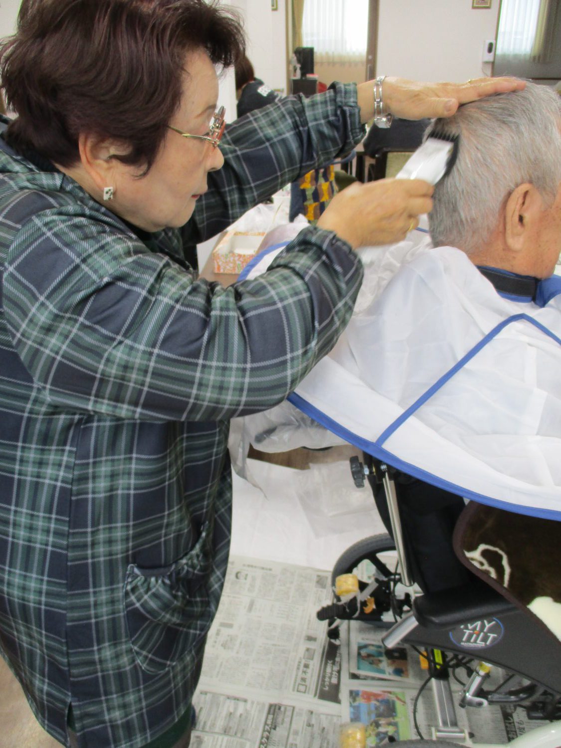 毎月、奥様が施設へお越しになりご主人の散髪をされています