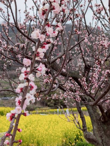 曇り空でしたが、菜の花の黄色のパワーとあんずの花の可愛らしさに