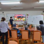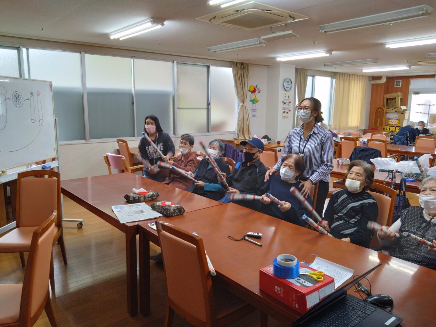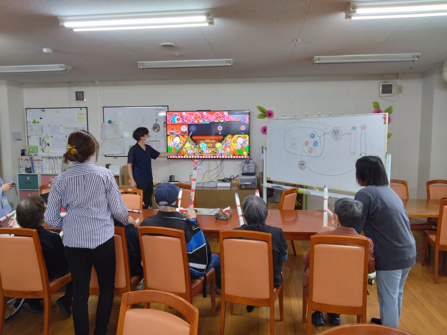 こんにちは!ゆうゆう今津デイサービスです。私達がいるデイサービスは「みんなの笑顔」を目的に様々なレクレーションを行っています。晴れた時には近くの公園に行って機能訓練指導員によるノルディックウォーキングをしたり、フロアでは、健康ゲーム指導士によるテレビゲームで太鼓の達人やチャンバラで楽しんでいます。次回までに、どんな楽しい事をしましょうか?お楽しみに!