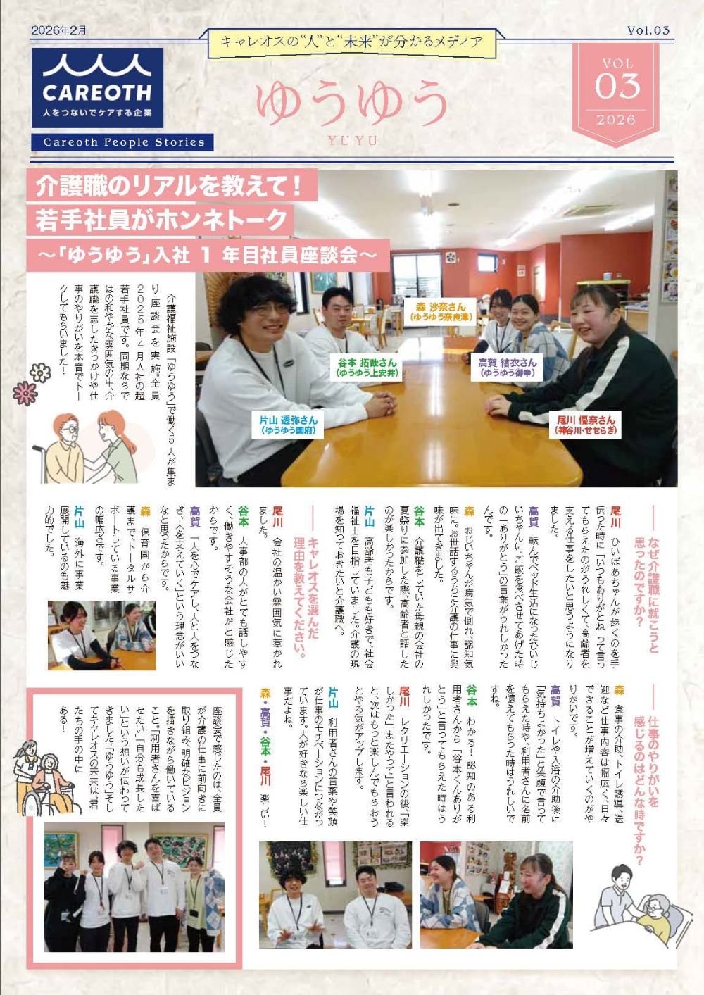 座談会で感じたのは、5人それぞれが介護の仕事に前向きに取り組み、楽しんで仕事をしていること。言葉の端々から「利用者さんを喜ばせたい」「自分も成長したい」という想いが伝わってきました。入社1年目で、明確なビジョンを描きながら働いていることに驚きました。「ゆうゆう」そしてキャレオスの未来は、君たちの手の中にある!